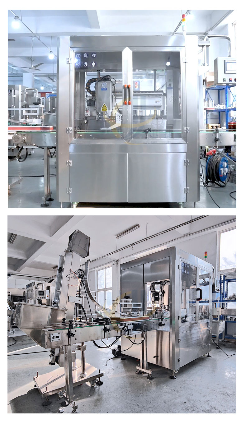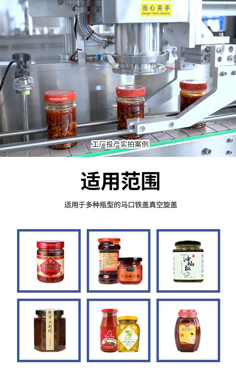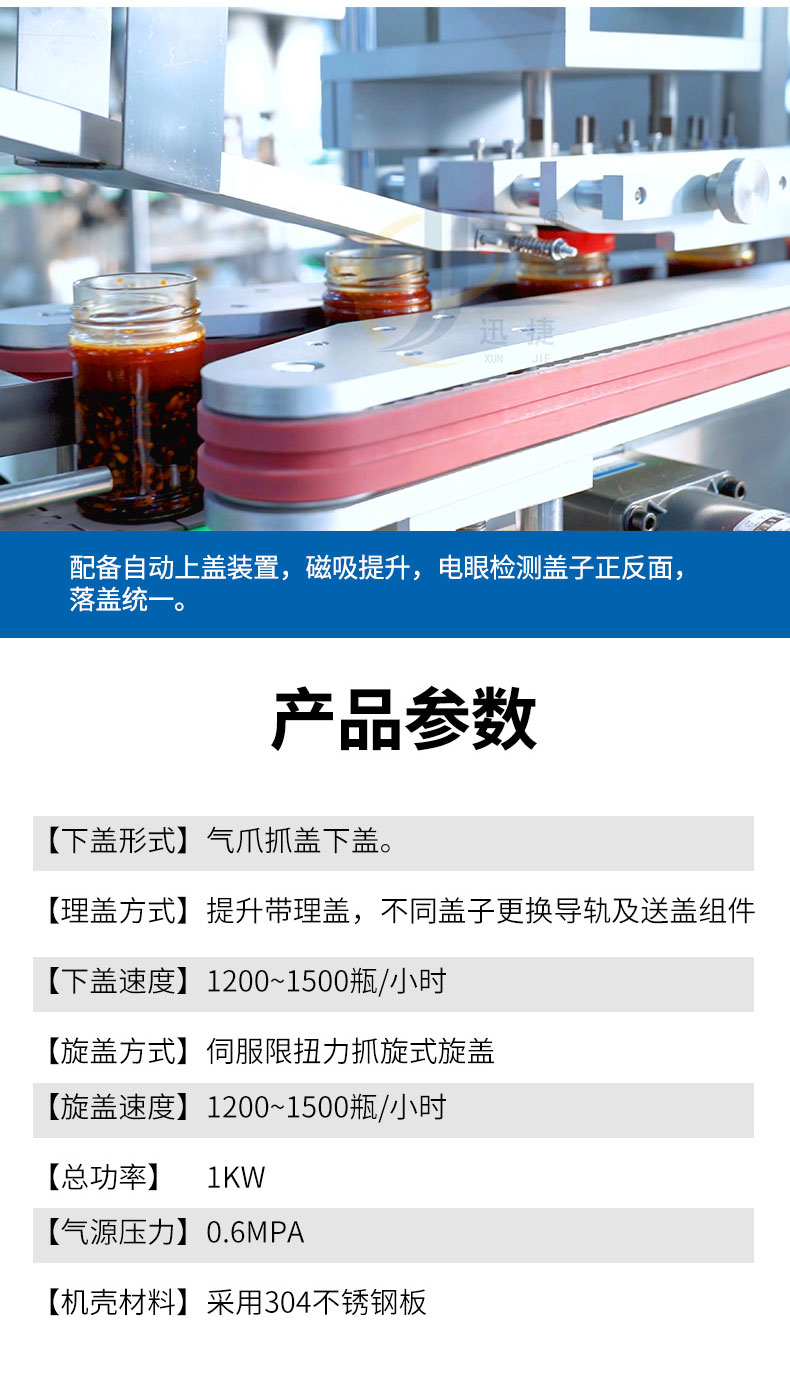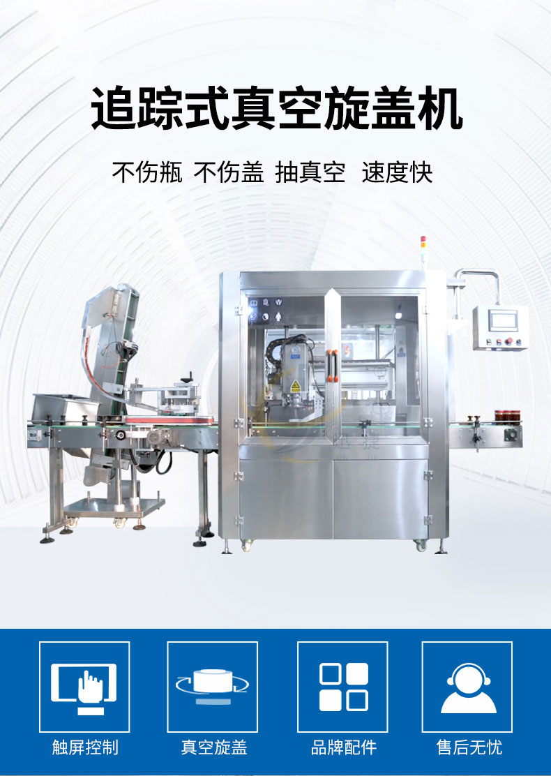 跟踪式真空旋盖机适用于多种瓶型的马口铁盖真空旋盖。设备由PLC结合触摸屏控制,采用世界知名品牌电器和气动元件,故障率低。