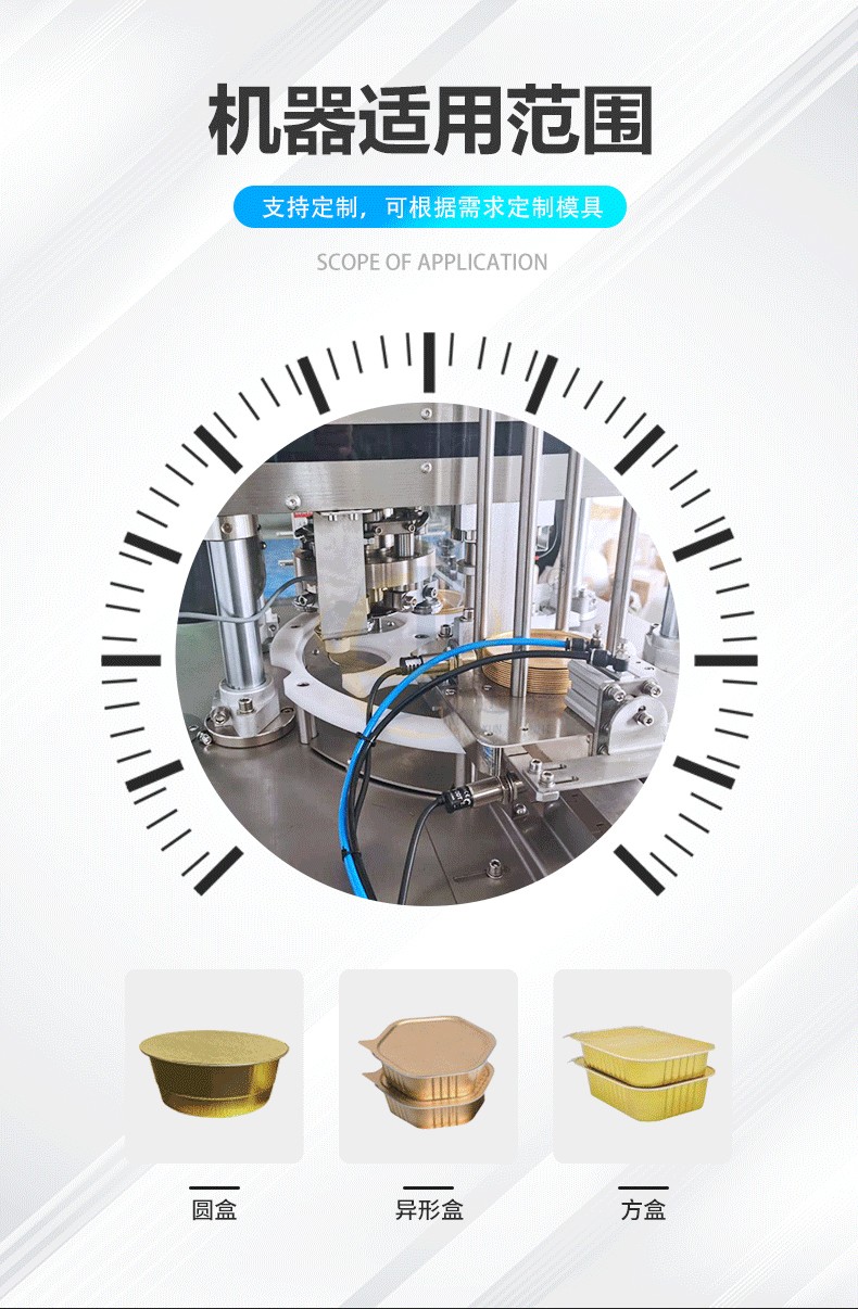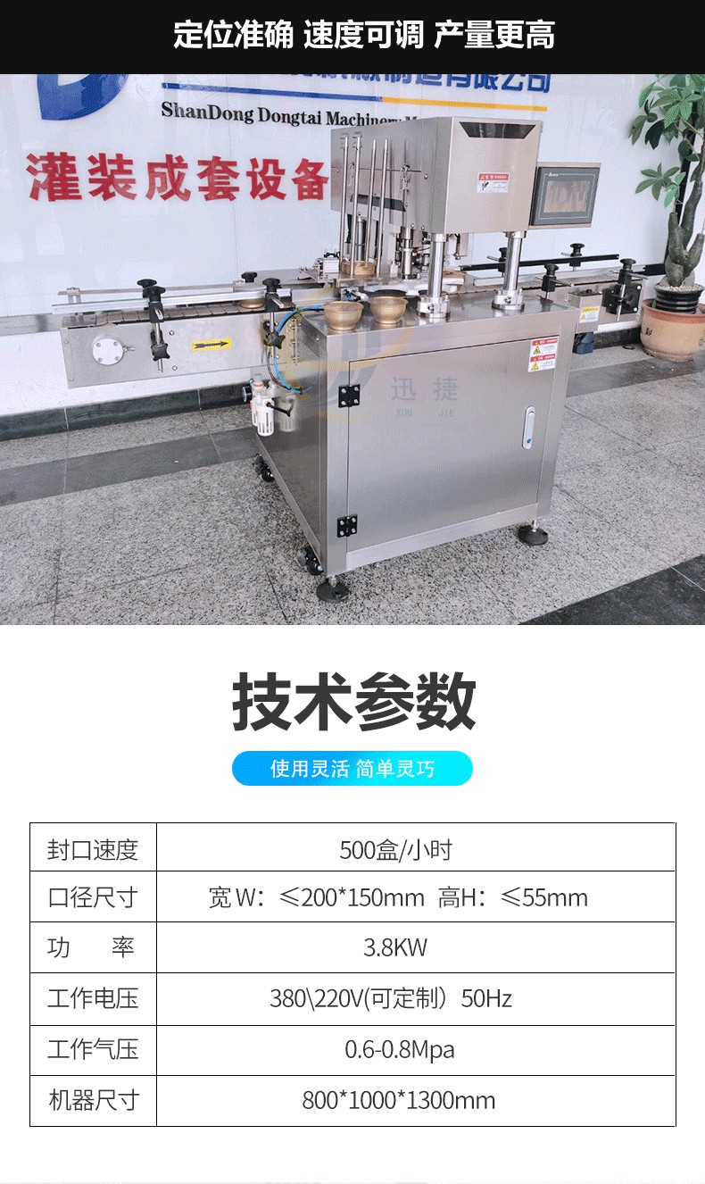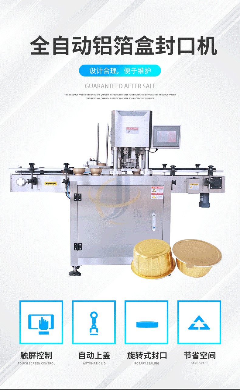 全自动铝箔盒封口机用途:用于咖喱酱、调料品、火锅料、果酱、辣椒酱、酱油醋、番茄酱等杯盒的自动灌装与封口。