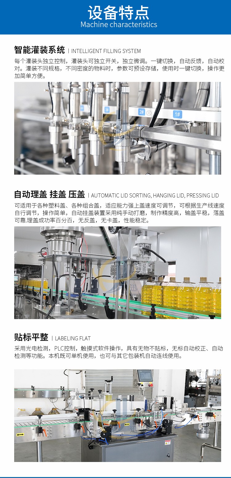 食用油灌装生产线2-16头可定制,兼容6种瓶型,容量范围内可兼容多种瓶型的灌装,一键式操作,开机即能使用。
