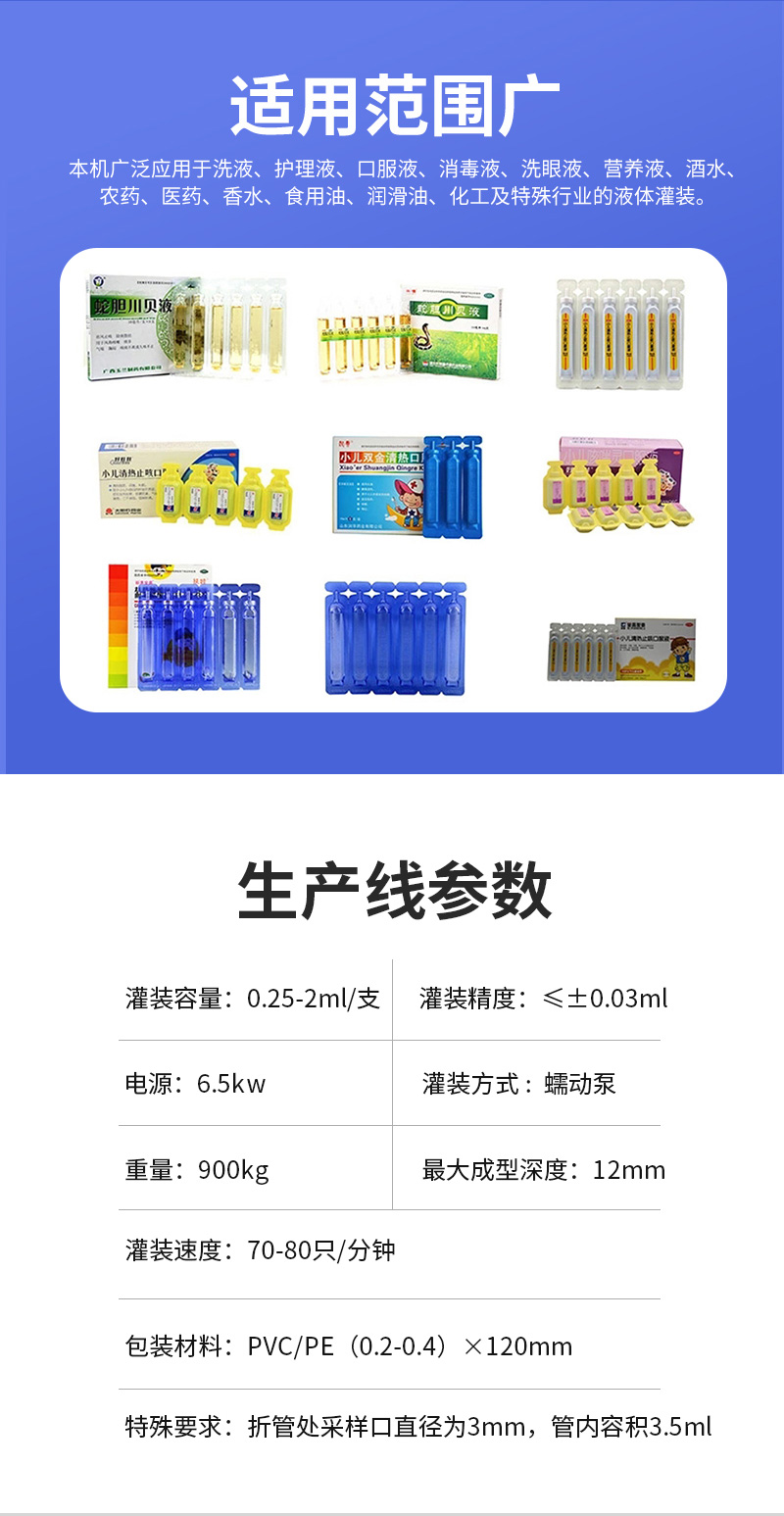 易折试剂管成型灌装机广泛使用于护理液、口服液、洗眼液、营养液、香水、食用油、润滑油、化工及特殊行业的液体灌装。