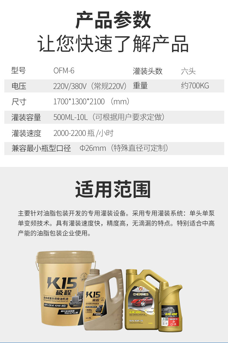全自动六头称重润滑油灌装机主要针对油脂包装开发的专用灌装设备。采用专用灌装系统:单头单泵单变频技术。具有灌装速度快