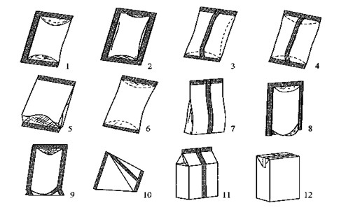袋装的形式多种多样,可分为大袋和小袋。而用于食品销售包装的各种小袋主要有以下几种。如下图所示。